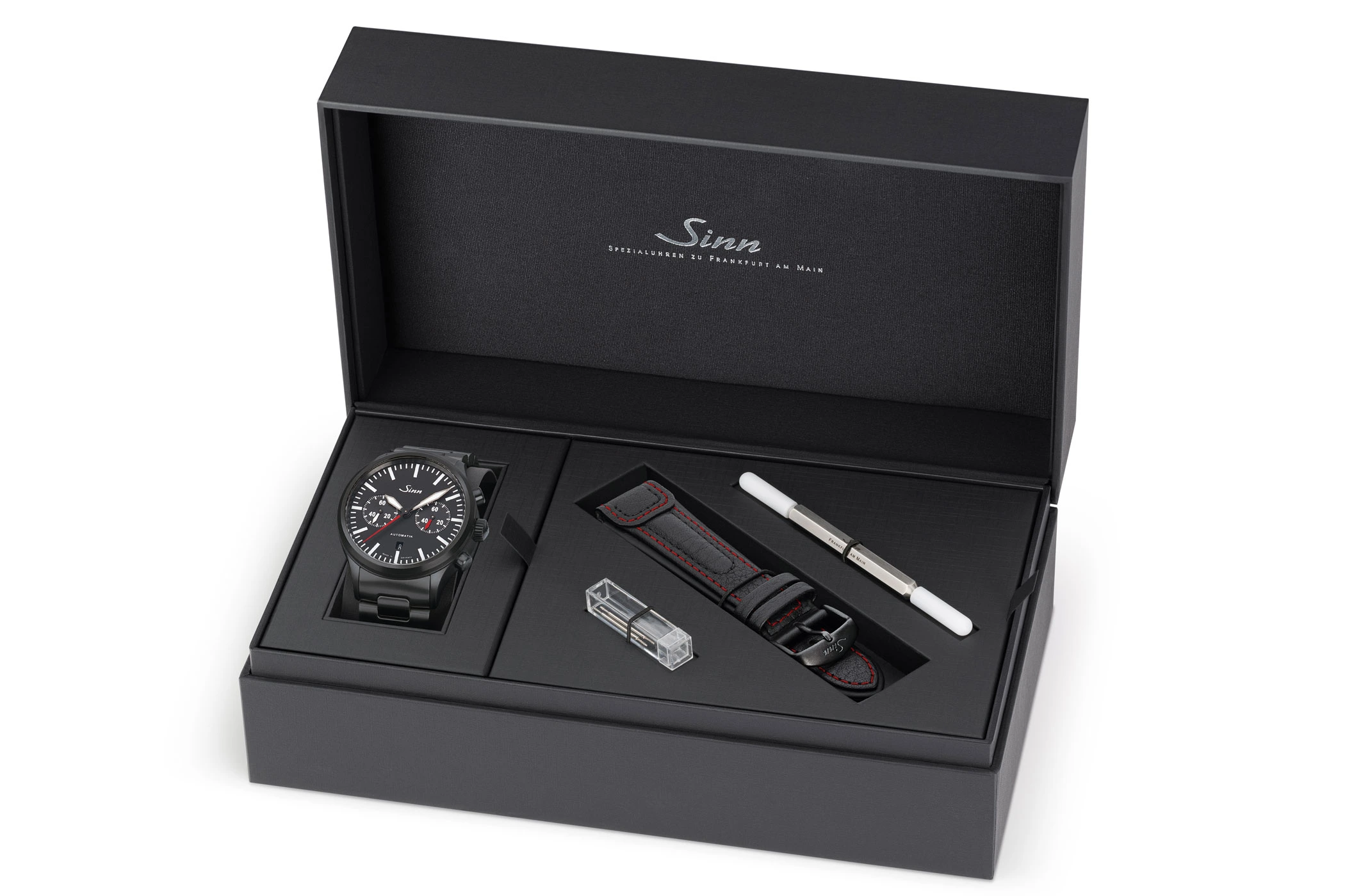 Geliefert wird die 936 S von SINN an einem schwarzen Edelstahlband in einem Doppeletui, inklusive eines zweiten Armbands aus schwarzem Leder mit roter Kontrastnaht sowie Bandwechselwerkzeug und Ersatzfederstegen. Der Preis beträgt 4.150 Euro.