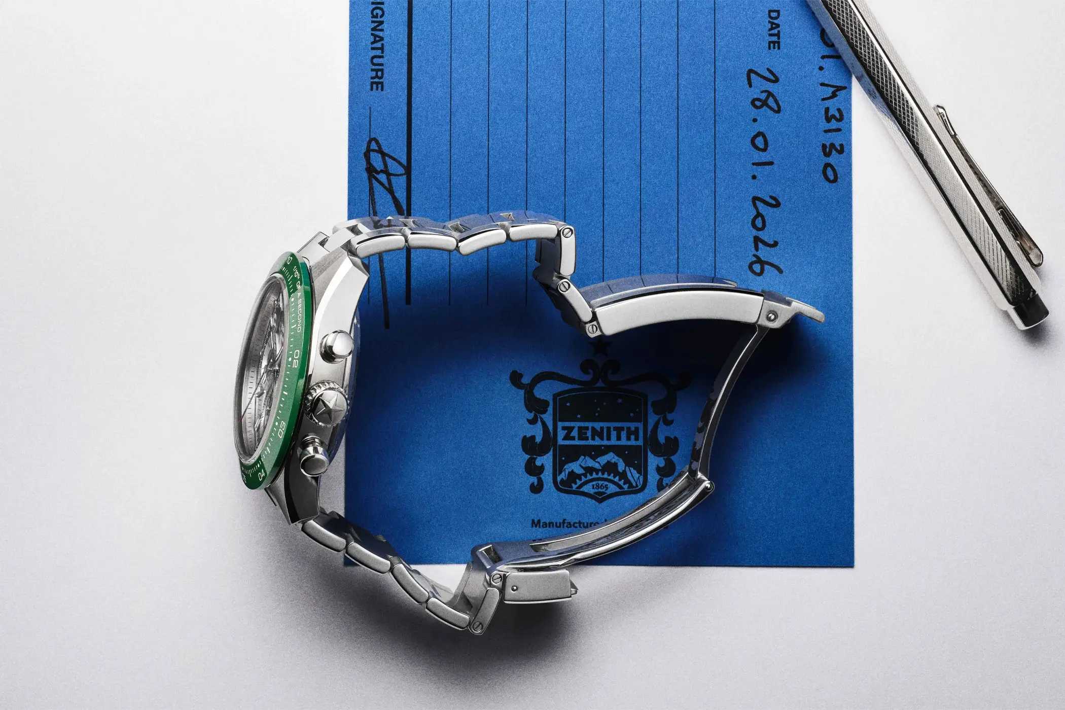 Drei Jahre Entwicklungszeit investierte Zenith in diese neue, aus 41 Komponenten bestehende Konstruktion. Forschung, Feinabstimmung, Optimierung und zahlreiche Tragesimulationen führten zur neuen, patentierten Faltschließe, die künftig schrittweise bei weiteren Referenzen eingesetzt werden soll. Vorerst sichert sie die beiden neuen Chronomaster Sport Skeleton-Edelstahl-Modelle. Kombiniert mit einem Metall beziehungsweise einem zusätzlichen, farblich abgestimmten Kautschukband.