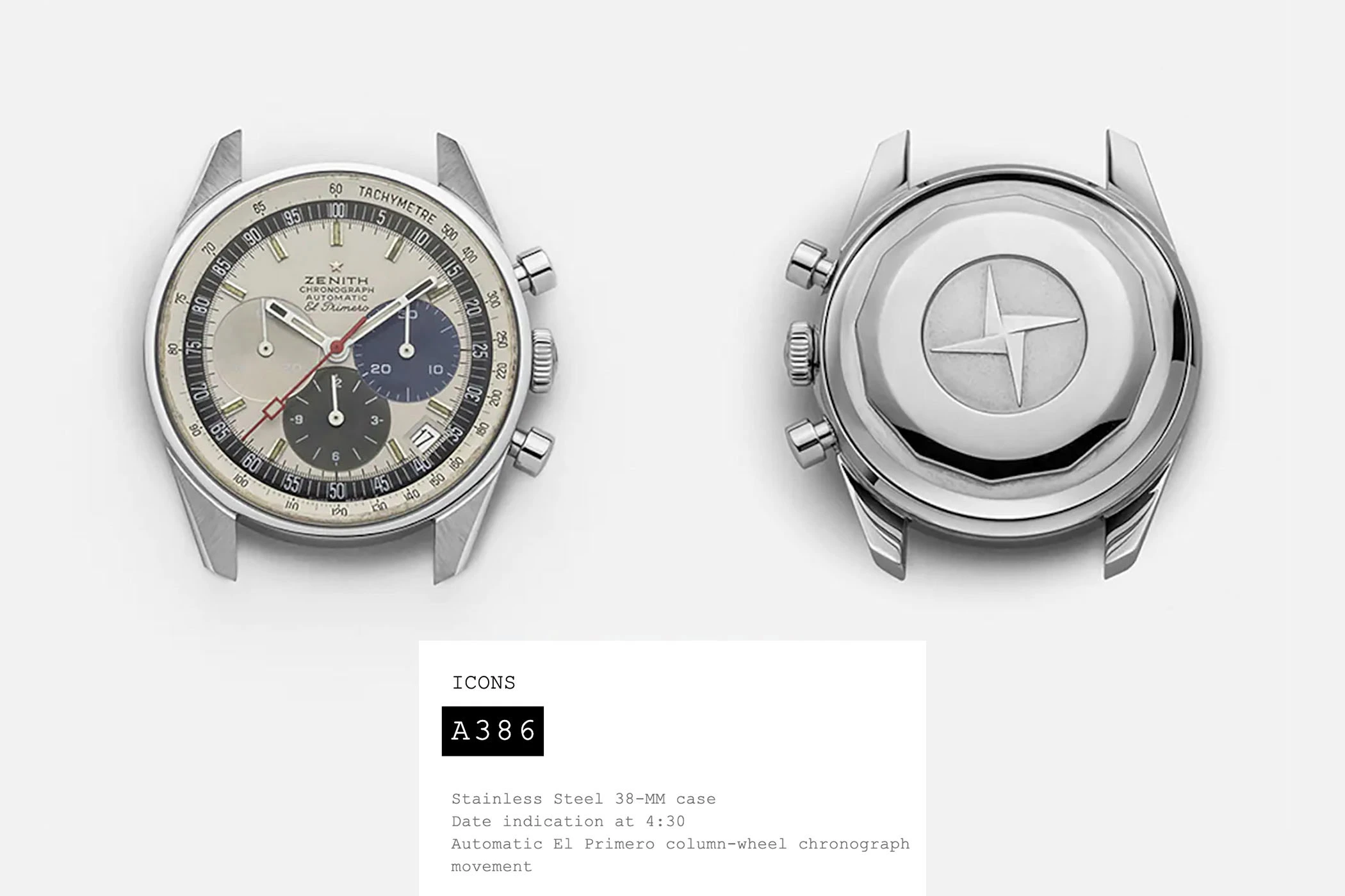 Das weltweit erste automatische integrierte Hochfrequenz-Chronographenkaliber erschien 1969. Eine seiner ersten Wirkungsstätten war das Edelstahlmodell A386. Die bis 1972 produzierten 4.500 Exemplare dieser Uhr zeigten sich mit einem Tricolor-Zifferblattdesign, das sich klar von den damaligen einfarbigen Chronographen-Layouts unterschied. Heute ist es – neben der obligatorischen Ausstattung mit einem El-Primero-Werk – ein prägendes Merkmal vieler Modelle der Chronomaster-Kollektion.